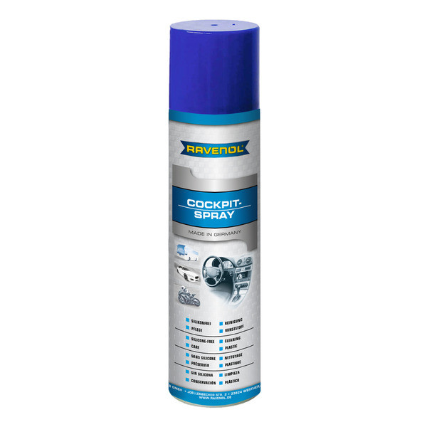 RAVENOL Cockpit – Spray — Germaniyada ishlab chiqarilgan, avtomobil ichki qismlaridagi panel va plastik elementlarni tozalash uchun mo‘ljallangan to‘liq sintetik vosita.