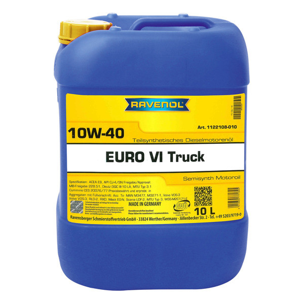 RAVENOL EURO VI Truck SAE 10W-40, partikulyar filtr bilan jihozlangan texnika uchun, shuningdek, katalitik neytralizator bilan yoki undan holda qo'yiladigan talablarni qondiradi.