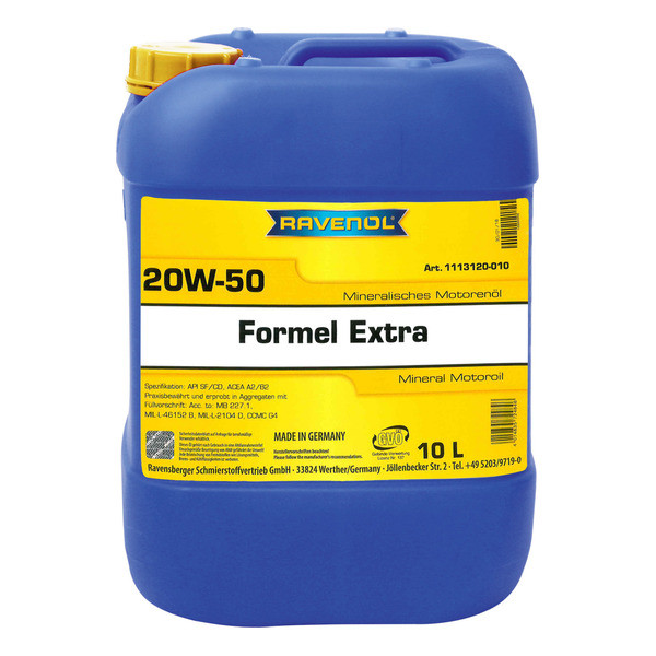RAVENOL Formel Extra SAE 20W-50 – mineral motor moyi, benzin va dizel yengil avtomobillari uchun, turbinali va turbinasiz motorlar hamda tijorat transporti uchun ishlab chiqarilgan.