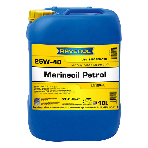 RAVENOL MARINEOIL PETROL SAE 25W-40 — bu sintetik komponentlar qo‘shilgan mineral asosli motor moyi bo‘lib, kemalardagi dvigatellar uchun mo‘ljallangan. Statsionar va osilgan benzinli kemalar dvigatellari uchun mos keladi.