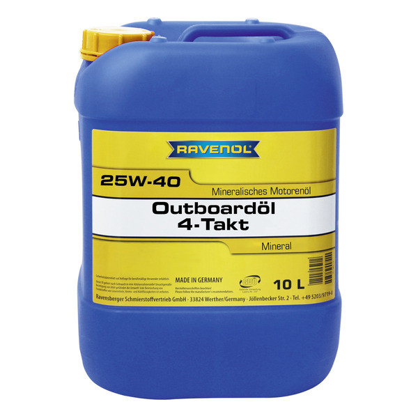 RAVENOL Outboardoel 4T SAE 25W-40 — NMMA FC-W va NMMA FC-W (CAT) talablariga mos keluvchi, yonilg‘i purkash tizimiga ega 4 taktli osiladigan qayiq dvigatellari uchun maxsus formulali mineral motor moyidir.