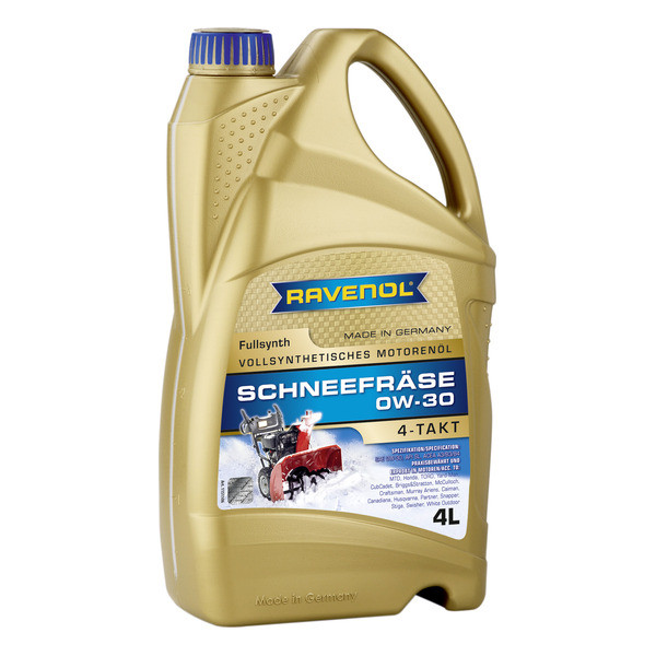 RAVENOL Schneefraese 4-Takt 0W-30 - yuqori sifatli, to'liq sintetik, yashil rangdagi motor moyi, past haroratlarda ishlaydigan kichik hajmdagi 4-taktli dvigatellar uchun mo'ljallangan.