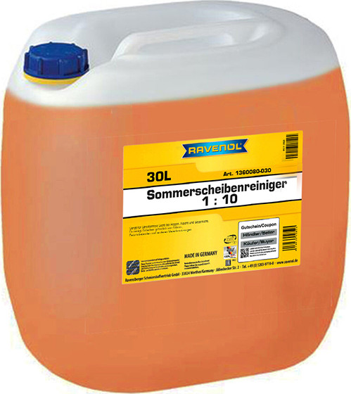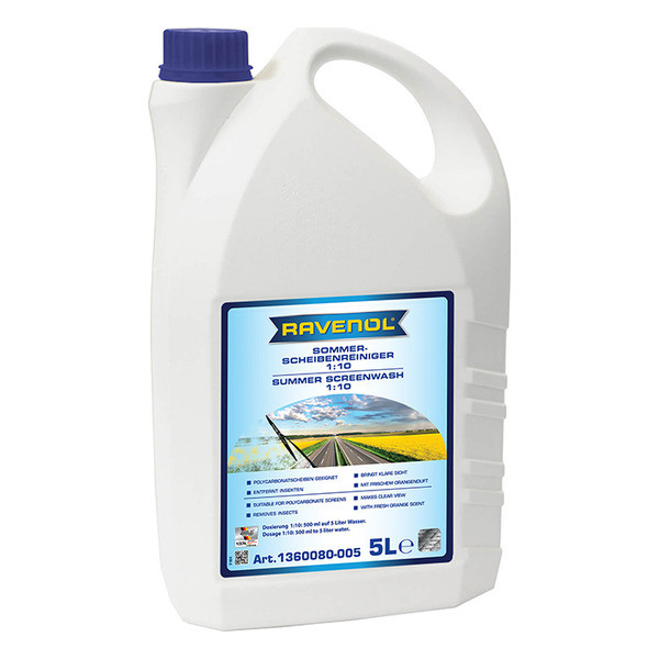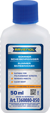 RAVENOL Sommer-Scheibenreiniger 1:10 — apelsin hidi bilan avtomobil oynasini yuvish uchun mo‘ljallangan yozgi kontsentrat suyuqlik. Avtomobilning oynani yuvish idishiga quyiladi. Zamonaviy barcha avtomobil markalarining oynatozalagich tizimlari uchun ishlab chiqilgan.