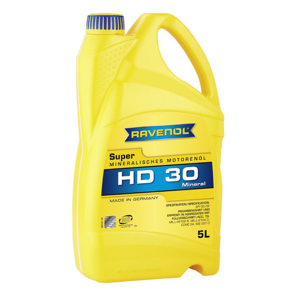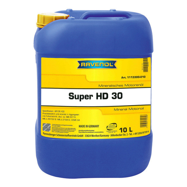 RAVENOL Super HD 30 is mineral mono grade engine oil for passenger car gasoline and diesel engines with and without turbocharging, and is also suitable for commercial vehicle engines and vans under light loads which require this grade of oil. Designed to minimize friction and wear, the formulation ensures year round high lubricity throughout all operating conditions. Extended oil drain capability where recommended by the vehicle manufacturer.
