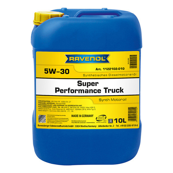 RAVENOL Super Performance Truck SAE 5W-30 – yuqori sifatli, oqimchanligi yuqori USHPD sinfiga mansub motor moyi bo‘lib, sintetik asosiy moylar va maxsus qo‘shimchalar paketi asosida ishlab chiqarilgan. Og‘ir yuk mashinalari, avtobuslar va qurilish texnikalarining yuqori yuklangan turbodizel dvigatellari uchun butun yil davomida foydalanish uchun mo‘ljallangan.