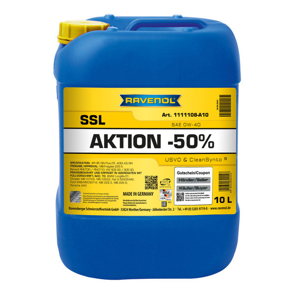 RAVENOL SSL 0W-40 – CleanSynto® va USVO® texnologiyalari asosida ishlab chiqarilgan to‘liq sintetik, oson oqadigan motor moyi. Benzinli va dizel dvigatellar uchun mo‘ljallangan bo‘lib, turbokompressor va to‘g‘ridan-to‘g‘ri yoqilg‘i purkash tizimiga ega yoki ega bo‘lmagan avtomobillarga mos keladi. Ishlab chiqaruvchilar tomonidan tavsiya etilgan uzaytirilgan moy almashtirish intervallariga javob beradi.