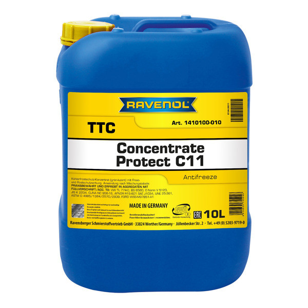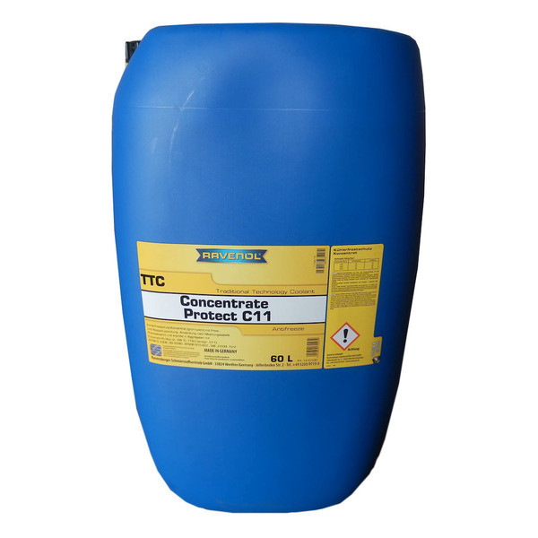 RAVENOL TTC - Protect C11 Concentrate – etilenglikol asosidagi antifriz kontsentrati bo‘lib, tarkibida nitritlar, aminlar va fosfatlar mavjud emas. Dvigatel tarkibidagi barcha metall elementlar, shu jumladan alyuminiy va turli qotishmalarni uzoq muddat (5 yilgacha) korroziyaga qarshi himoya bilan ta’minlaydi.