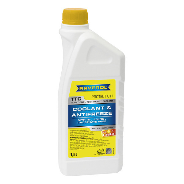 RAVENOL TTC Trad. Techn. Coolant HOT CLIMATE -15°C is a ready to use, prediluted with water, ethylene-glycol based and time-tested coolant without phosphates, nitrites and amines. This product is formulated based on a proven inhibitor development as an extended life radiator antifreeze.