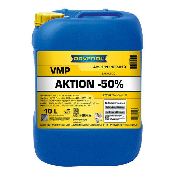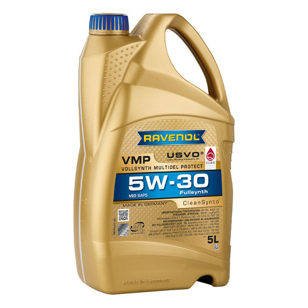 RAVENOL VMP 5W-30 – to‘liq sintetik, oson oqar, o‘rtacha kul miqdoriga ega (MID SAPS) motor moyi bo‘lib, USVO® va CleanSynto® texnologiyalari asosida ishlab chiqarilgan. Yengil benzinli va dizel dvigatellari, shuningdek, to‘g‘ridan-to‘g‘ri yoqilg‘i quyish va turbokompressorli dvigatellar uchun mo‘ljallangan. Avtomobil ishlab chiqaruvchilari talablariga muvofiq, moy almashtirish oralig‘ini uzaytiradi.